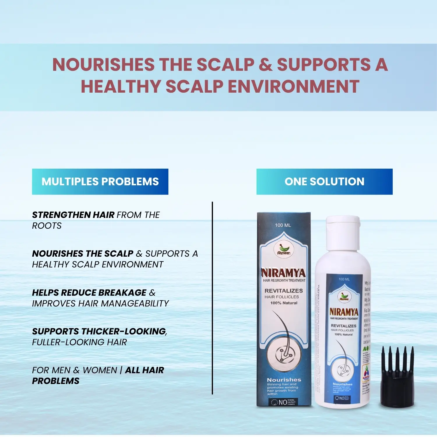 Niramya Hair Growth Vitalizer Oil is formulated to significantly improve hair texture, dandruff, volume, & promotes hair growth. It is a mix of natural ingredients prevent hair fall, promote hair growth & benefits in overall hair health.
