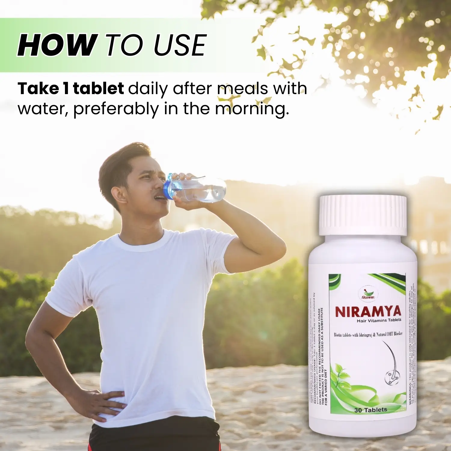 Hair vitamins for growth that target root causes of hair loss such as vitamin deficiency, poor nutrition, and DHT. Niramya hair vitamins for growth are made with natural and ayurvedic ingredients to promote thicker, healthier hair and manage hair fall. These multivitamins for hair are fortified with biotin and have natural DHT blockers like pumpkin seed extract, pygeum, green tea extract, and bhringraj.